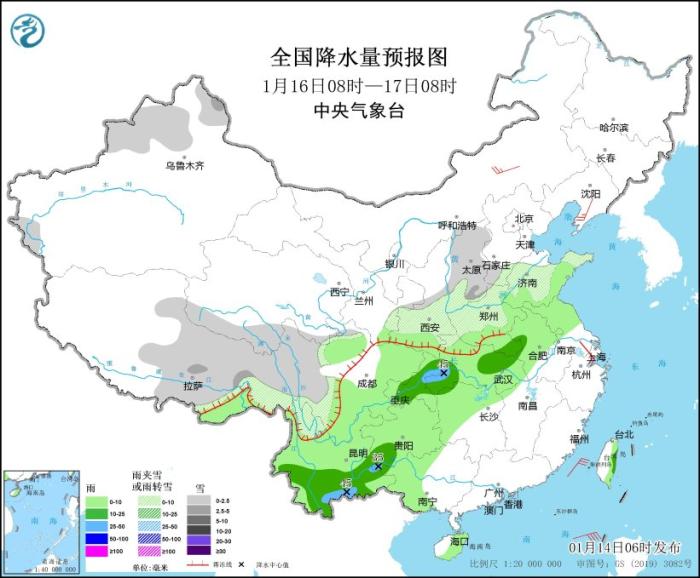 1月16日08时至17日08时,新疆北部、西藏中东部、青海南部、陕西中北部、华北南部和西部、黄淮西部和北部、川西高原、云南西北部等地部分地区有小到中雪或雨夹雪。黄淮南部、江淮大部、江汉、湖南西部和北部、西南地区大部、广西西部等地部分地区有小到中雨,其中,湖北西南部、重庆东北部、云南南部等地局地有大雨(25~45毫米)。内蒙古中部、辽东半岛等地部分地区有4~5级风。南海中北部海域将有6~7级风、阵风8~9级。