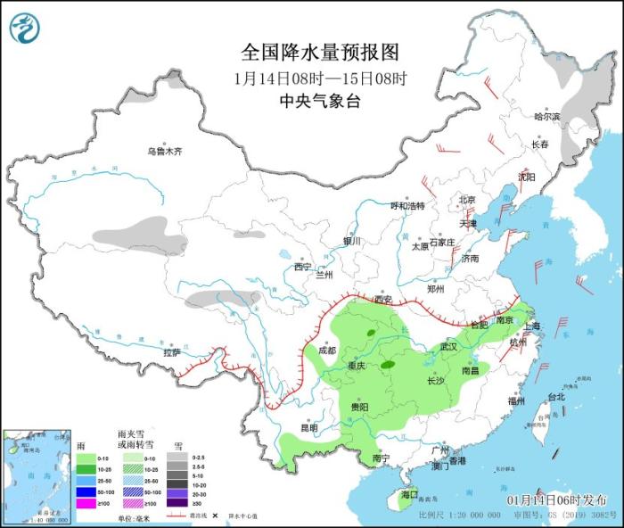 1月14日08时至15日08时,黑龙江北部和东部、吉林东部、新疆西北部、青海南部等地部分地区有小到中雪。西北地区东南部、江淮南部、江汉东部、江南中西部、西南地区东部、云南南部、广西西部和北部等地部分地区有小到中雨。内蒙古中东部、辽宁中部、华北东部、浙江中北部等地部分地区有4~5级风。渤海、渤海海峡、黄海、东海大部、南海中北部和西南部将有5~7级风,阵风8级。